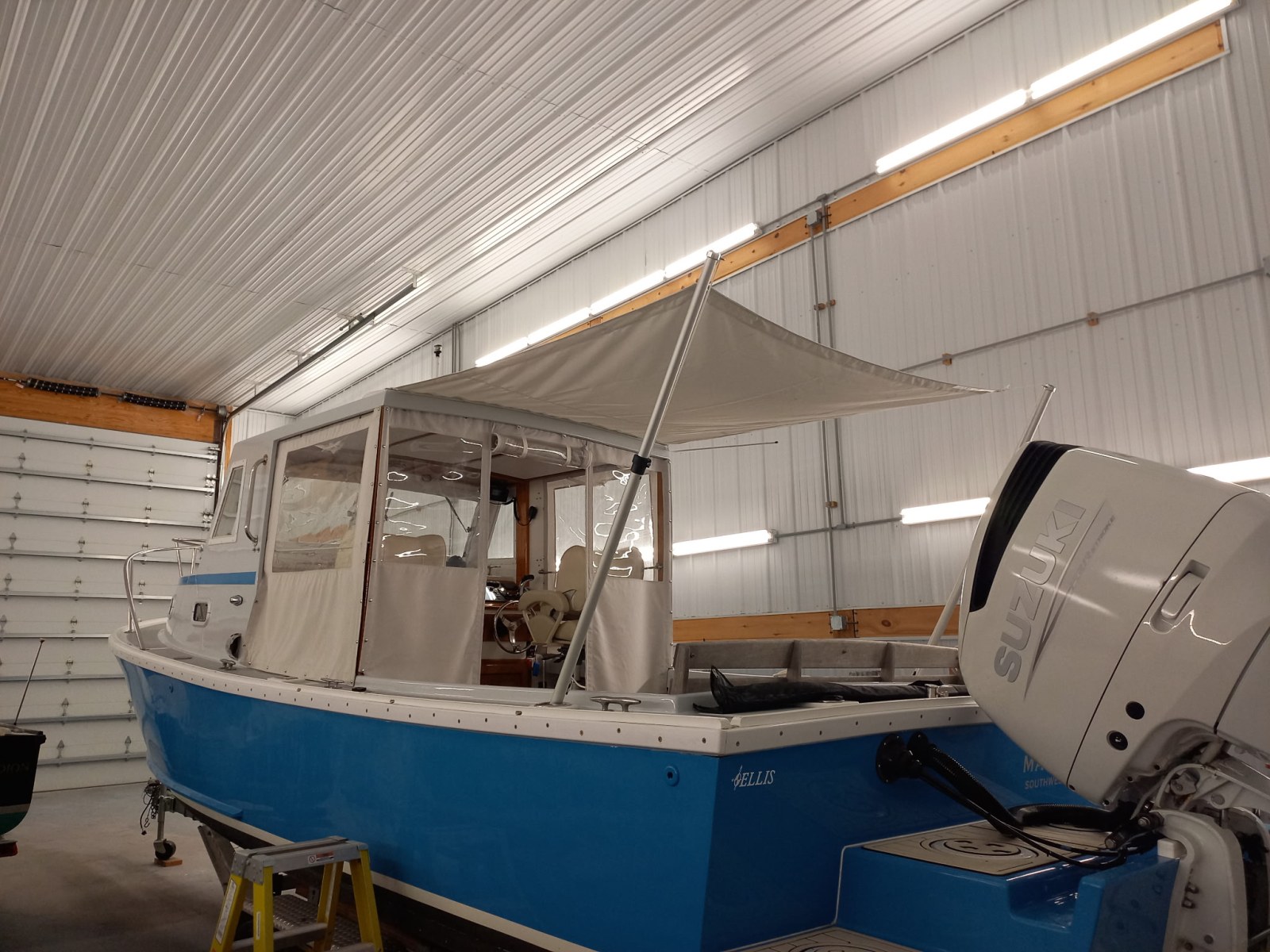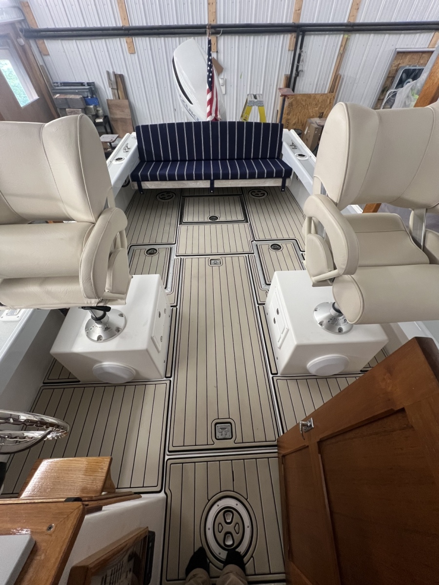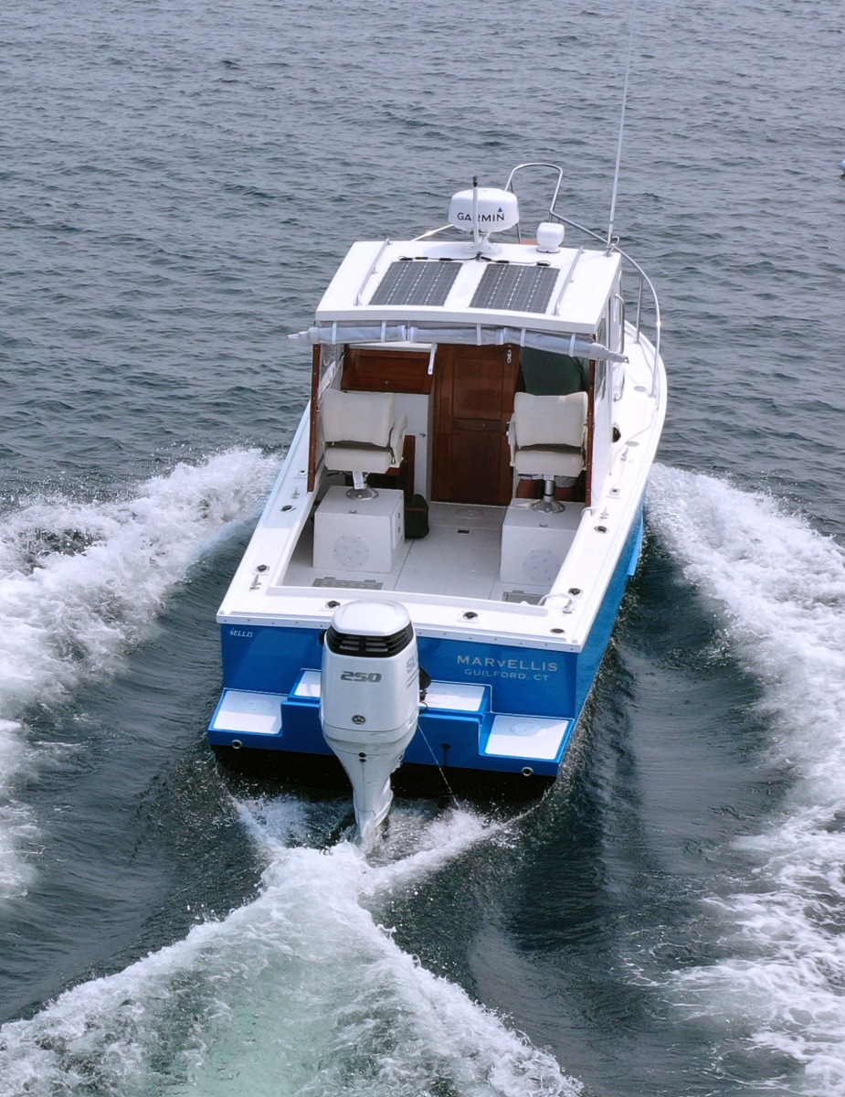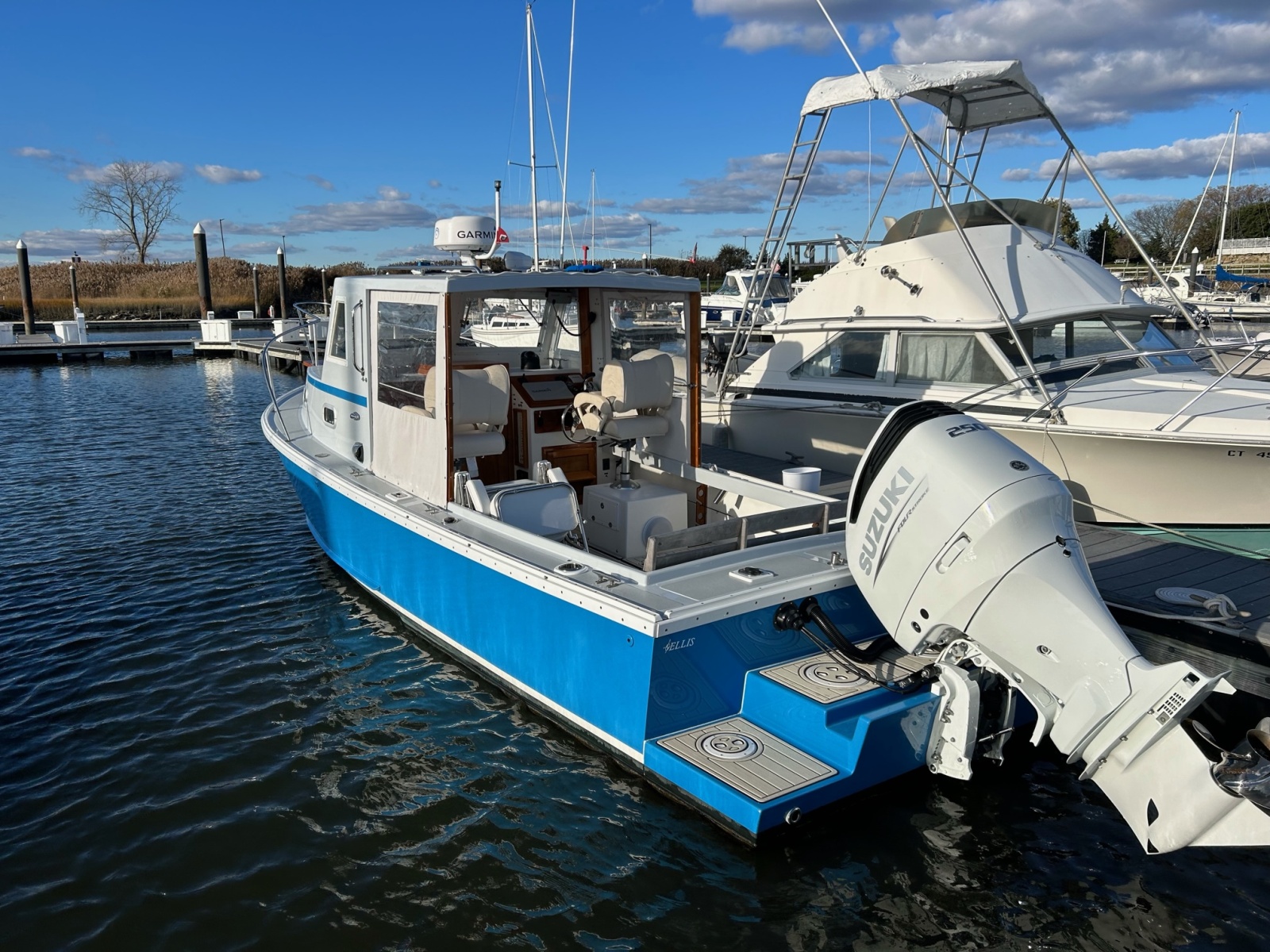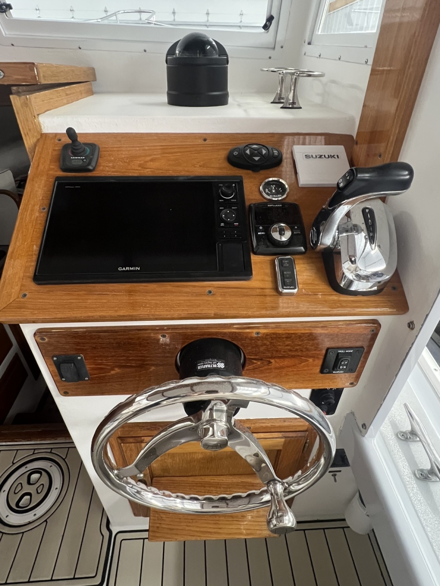 The Ellis 26 Lobster Yacht “MarvEllis” was restored by Ellis Boat Company in 2022. It features a 250 hp Suzuki outboard engine on Ellis’s new integrated swim platform, a bow thruster, Garmin plotter and radar, a full canvas enclosure, opening front windows, solar panels, a Fusion stereo, rod holders, saltwater and freshwater washdown, an anchor with windlass, and hull painting with Empress Blue Awl Craft. Since 2022, flooring, the aft bench with cushions, and trim tabs have been added. The topsides have been painted in a light gray. The cabin features a V-berth, a separate head (complete with a holding tank and macerator pump), a fridge, and a freshwater sink. The outboard has 150 hours (as of Fall 2025). Solar panels keep the batteries topped off. A dual-axel bunk trailer, new in 2021, is included.