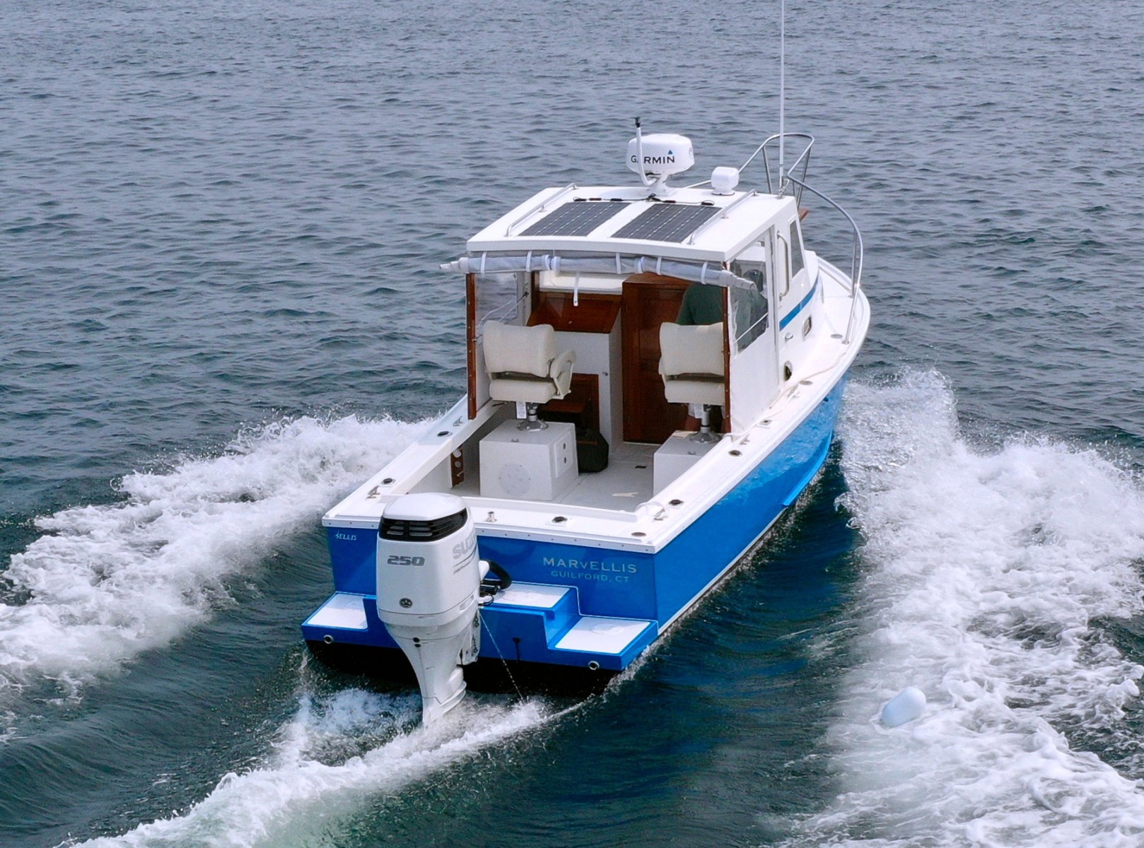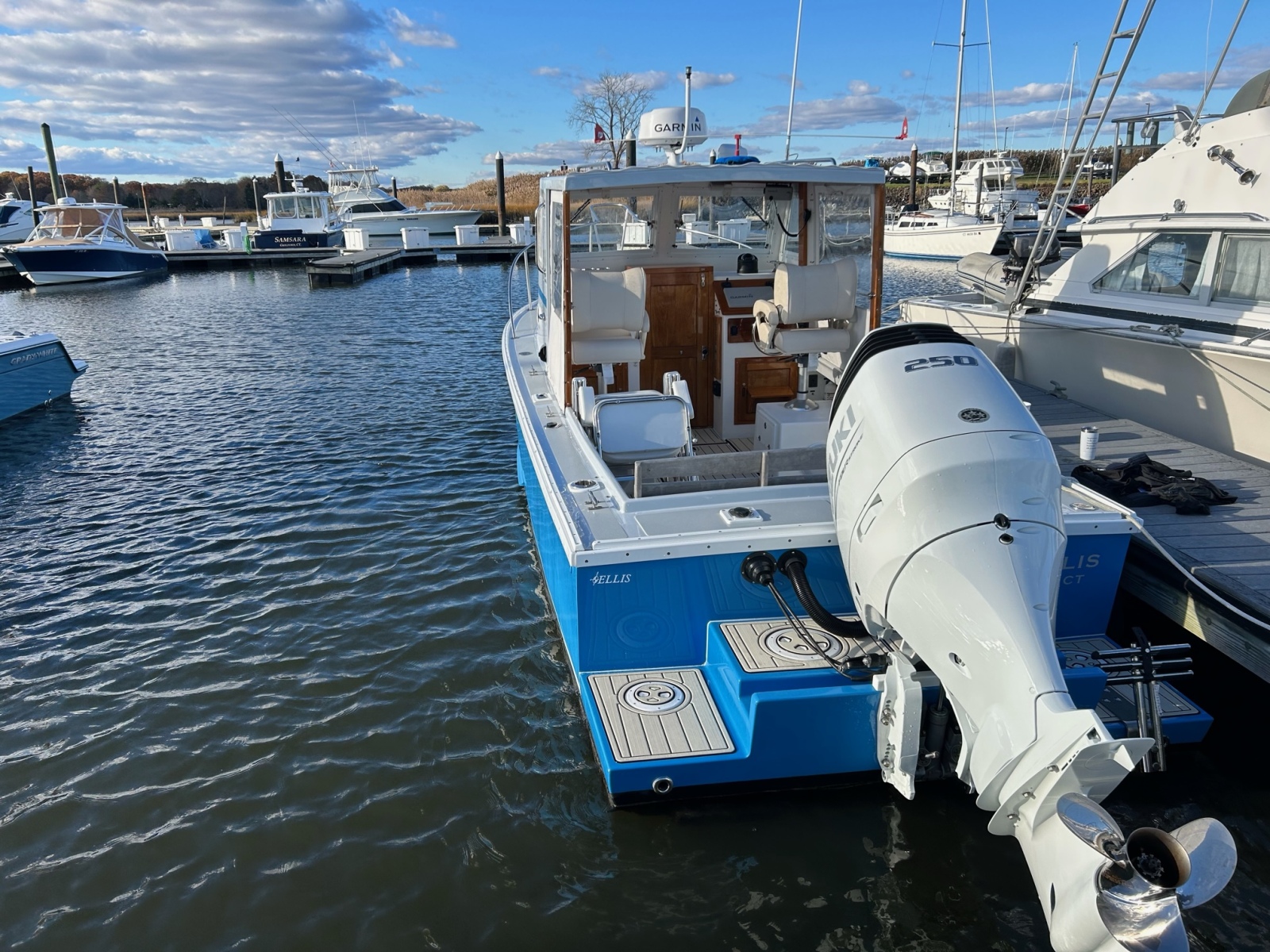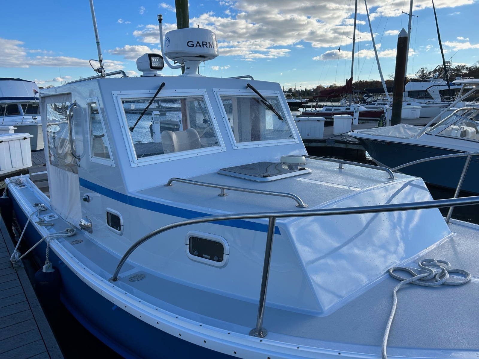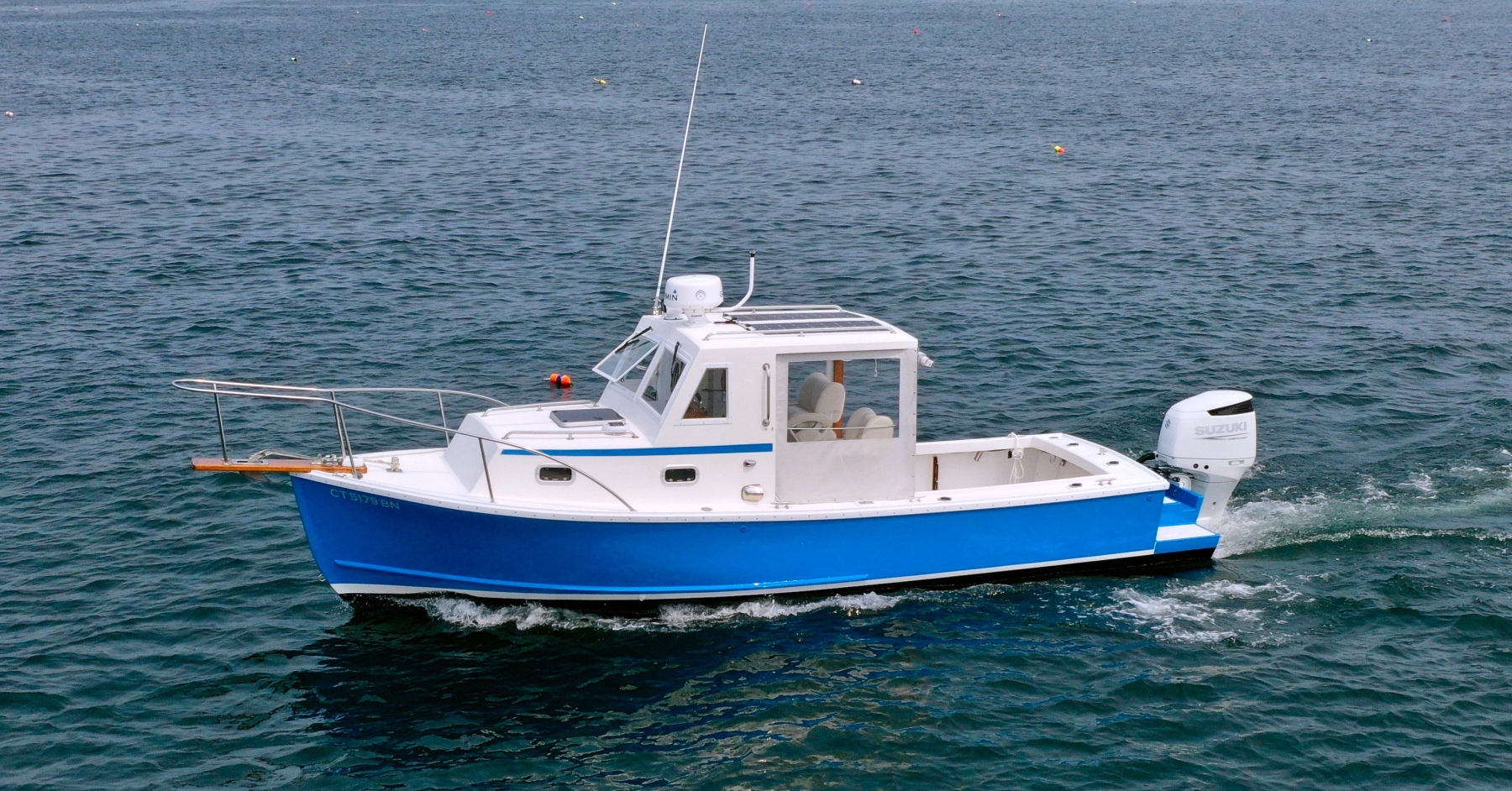 The Ellis 26 Lobster Yacht “MarvEllis” was restored by Ellis Boat Company in 2022. It features a 250 hp Suzuki outboard engine on Ellis’s new integrated swim platform, a bow thruster, Garmin plotter and radar, a full canvas enclosure, opening front windows, solar panels, a Fusion stereo, rod holders, saltwater and freshwater washdown, an anchor with windlass, and hull painting with Empress Blue Awl Craft. Since 2022, flooring, the aft bench with cushions, and trim tabs have been added. The topsides have been painted in a light gray. The cabin features a V-berth, a separate head (complete with a holding tank and macerator pump), a fridge, and a freshwater sink. The outboard has 150 hours (as of Fall 2025). Solar panels keep the batteries topped off. A dual-axel bunk trailer, new in 2021, is included.