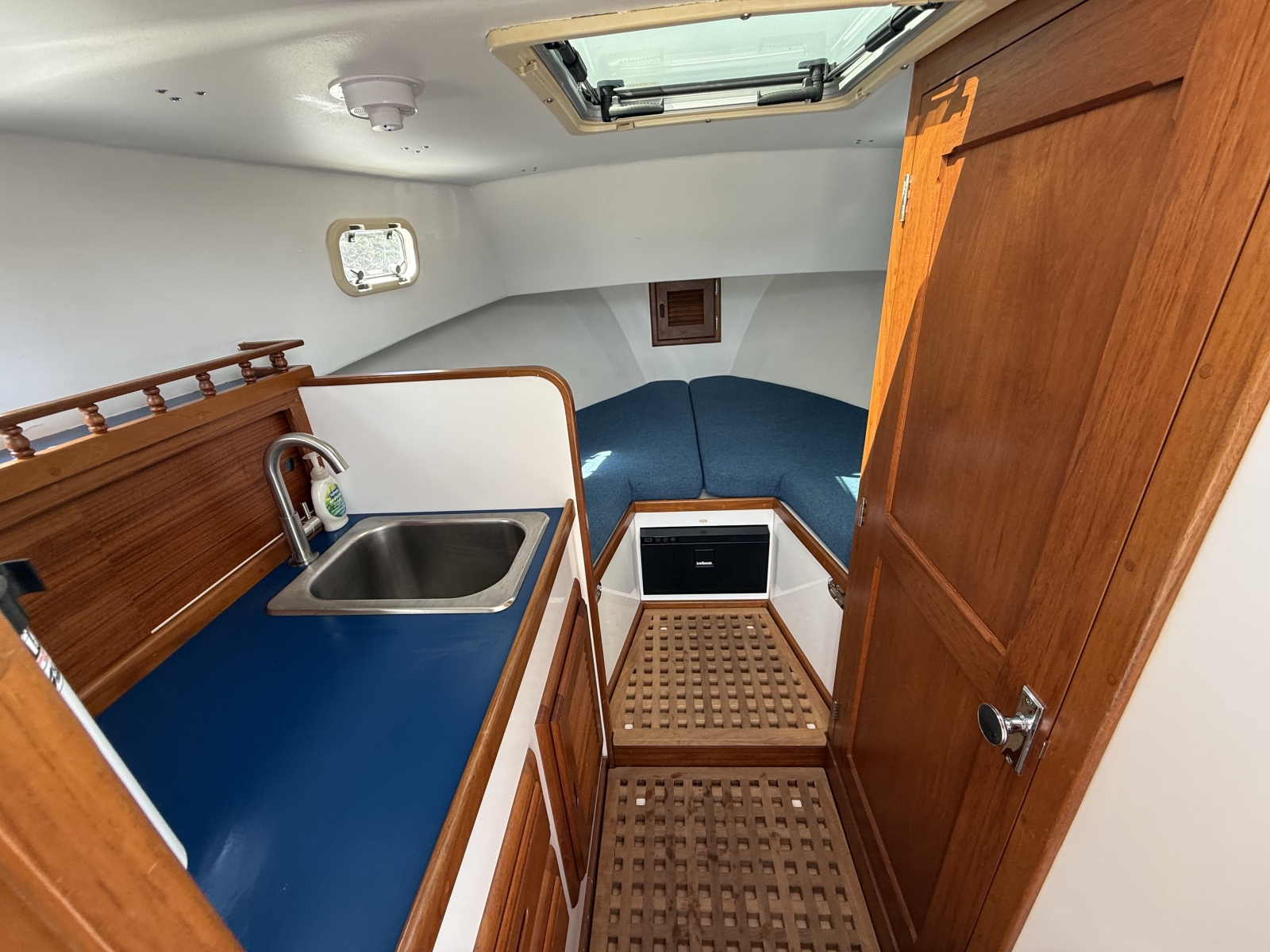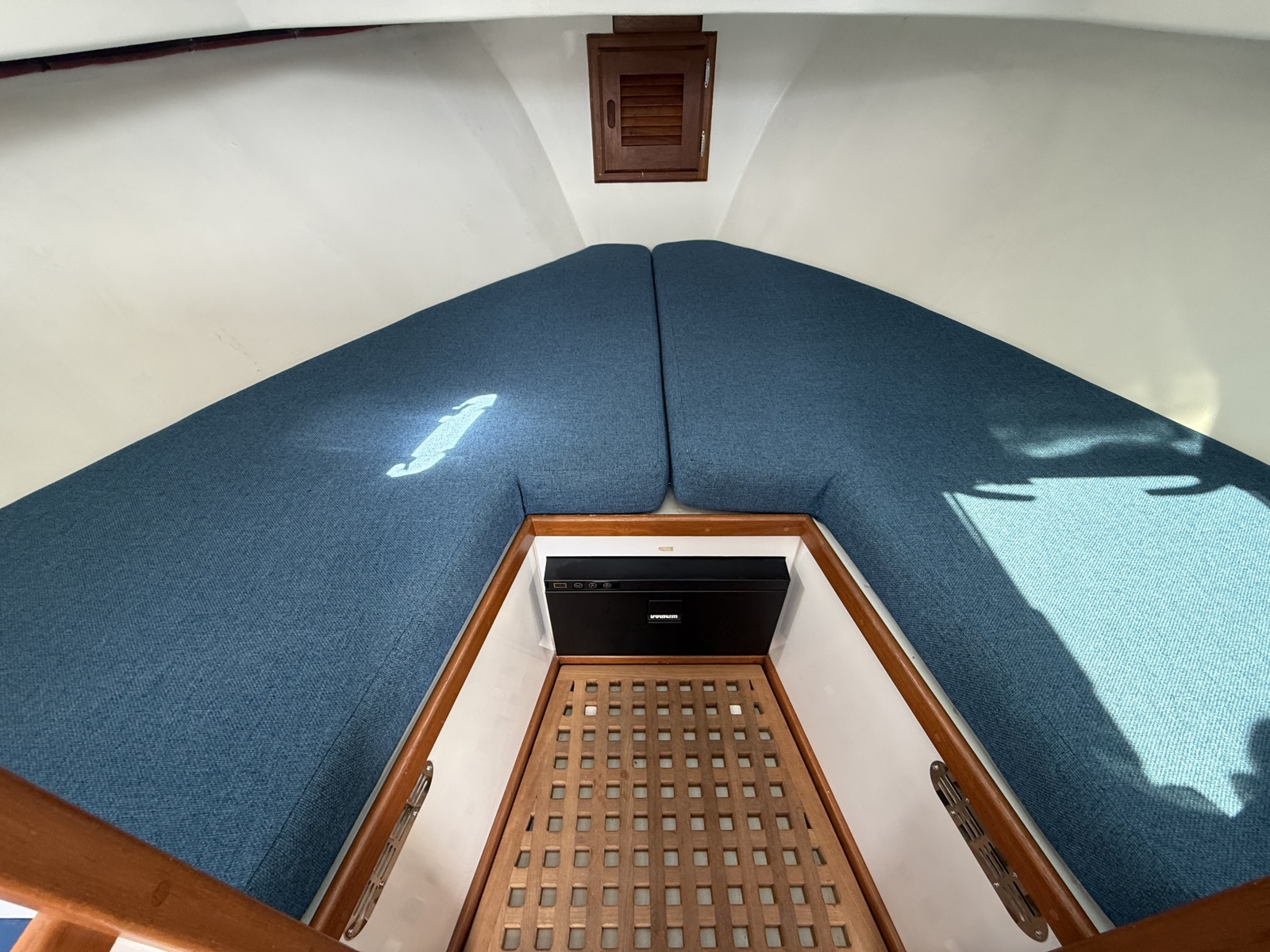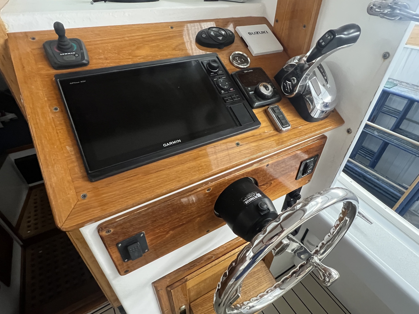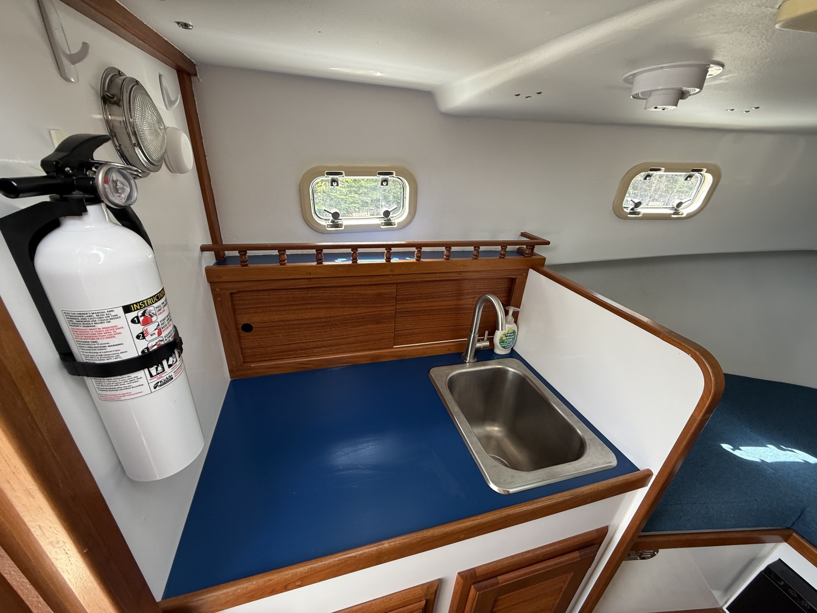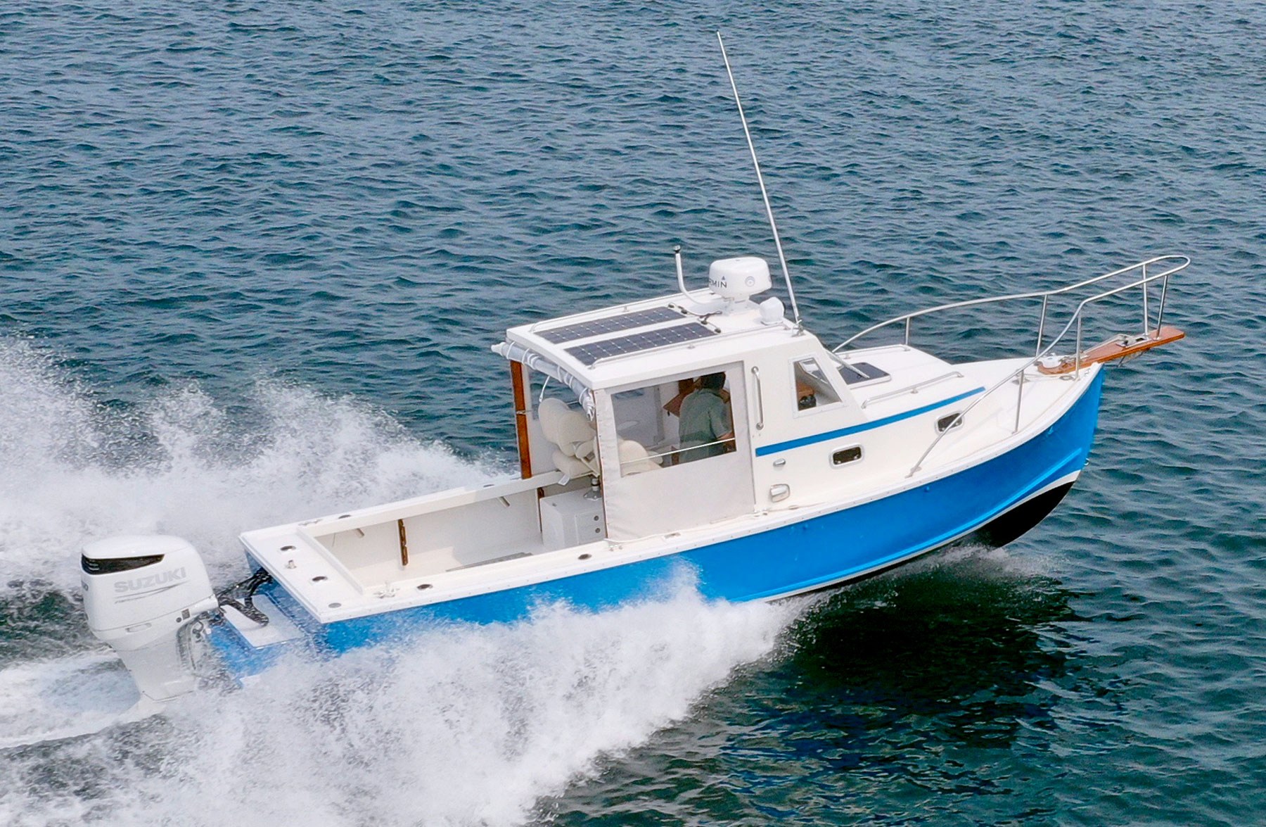 The Ellis 26 Lobster Yacht “MarvEllis” was restored by Ellis Boat Company in 2022. It features a 250 hp Suzuki outboard engine on Ellis’s new integrated swim platform, a bow thruster, Garmin plotter and radar, a full canvas enclosure, opening front windows, solar panels, a Fusion stereo, rod holders, saltwater and freshwater washdown, an anchor with windlass, and hull painting with Empress Blue Awl Craft. Since 2022, flooring, the aft bench with cushions, and trim tabs have been added. The topsides have been painted in a light gray. The cabin features a V-berth, a separate head (complete with a holding tank and macerator pump), a fridge, and a freshwater sink. The outboard has 150 hours (as of Fall 2025). Solar panels keep the batteries topped off. A dual-axel bunk trailer, new in 2021, is included.
